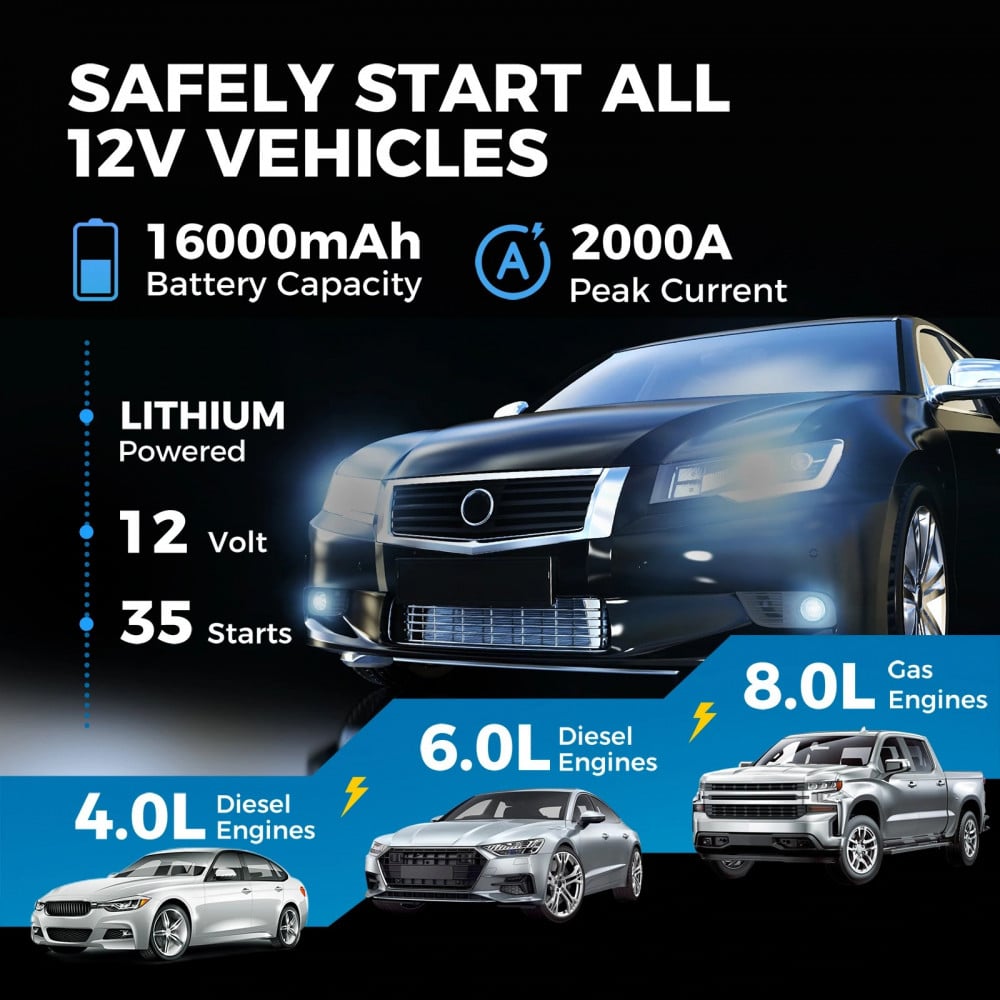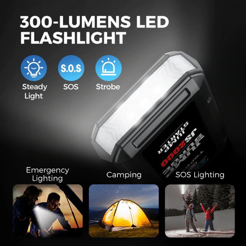 JumpSurge2000 هو بنك طاقة بقوة 2000 امبير يقوم بتشغيل المركبات التي تعمل ببطارية 12 فولت (حتى 8 لترات بنزين و 6 لتر ديزل). تعمل وظيفة Boost Function ™ على بدء تشغيل البطاريات الميتة أو التالفة. باستخدام JS2000 ، ستتمكن من إجراء ما يصل إلى 35 تشغيلة بشحنة واحدة ، ولن تقطع السبل بالبطارية الفارغة! يبقيك مصباح الليد المدمج بعيدًا عن الظلام ، وتتيح لك وظيفة بنك الطاقة شحن أجهزتك المحمولة بالكامل في أقل من ساعة.